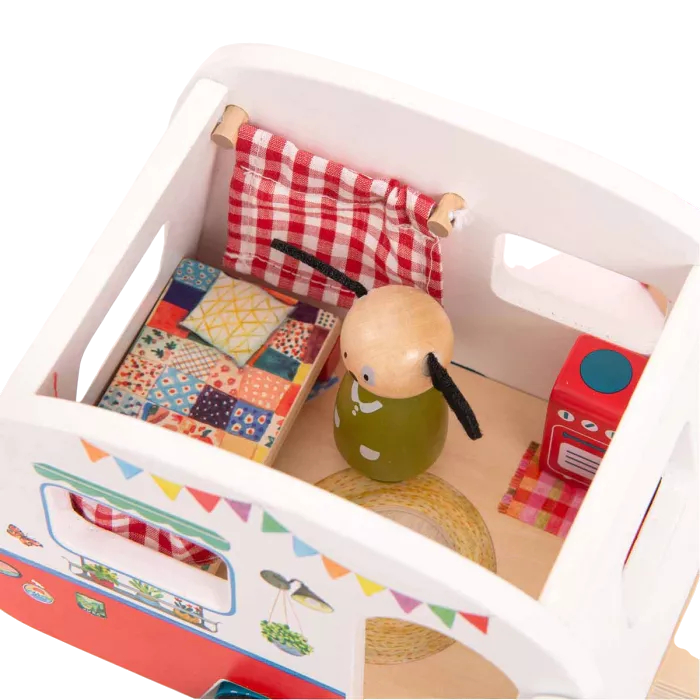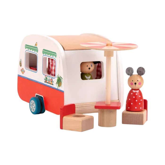 La Grande Famille part en vacances dans sa caravane ! Tout en bois, elle comprend un ensemble de mobilier, des rideaux en tissu vichy et un toit amovible pour les nuits étoilées. Elle peut être associée à la voiture week-end grâce à son attache-remorque. Personnages vendus séparément. L'attache de la remorque caravane est disponible en pièce détachée.