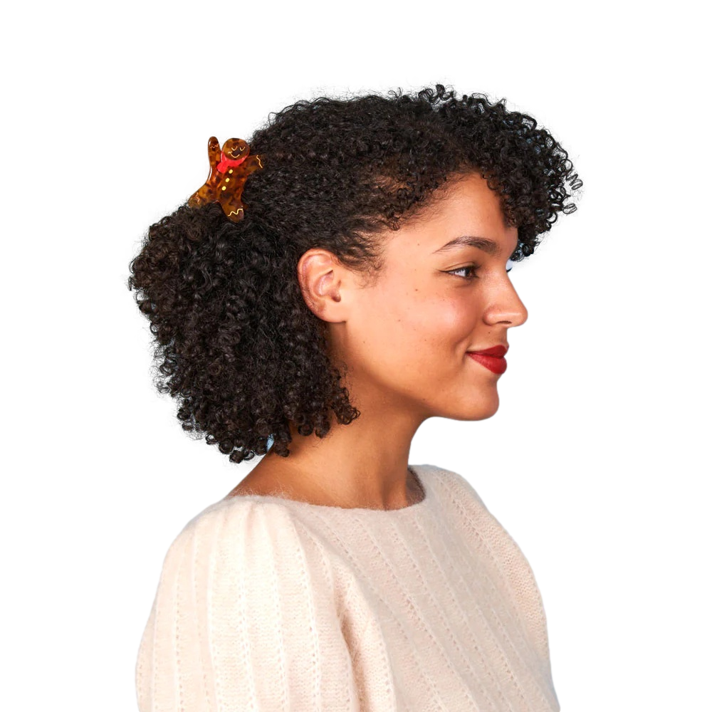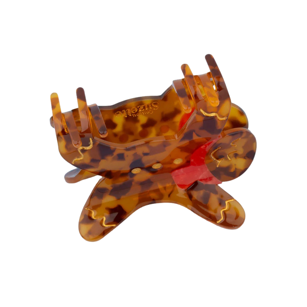 Que serait la période des fêtes sans des gingermen tout chauds sortis du four ? On célèbre ces biscuits de Noël qui nous enivreraient presque de leur douce odeur de cannelle, avec une pince à cheveux assortie, façon écaille de tortue, ornée d’une belle écharpe rouge et de détails dorés qui lui font une bouille à croquer. Au top pour des coiffures festives et cosy tout l’hiver !- Composition : acétate de cellulose