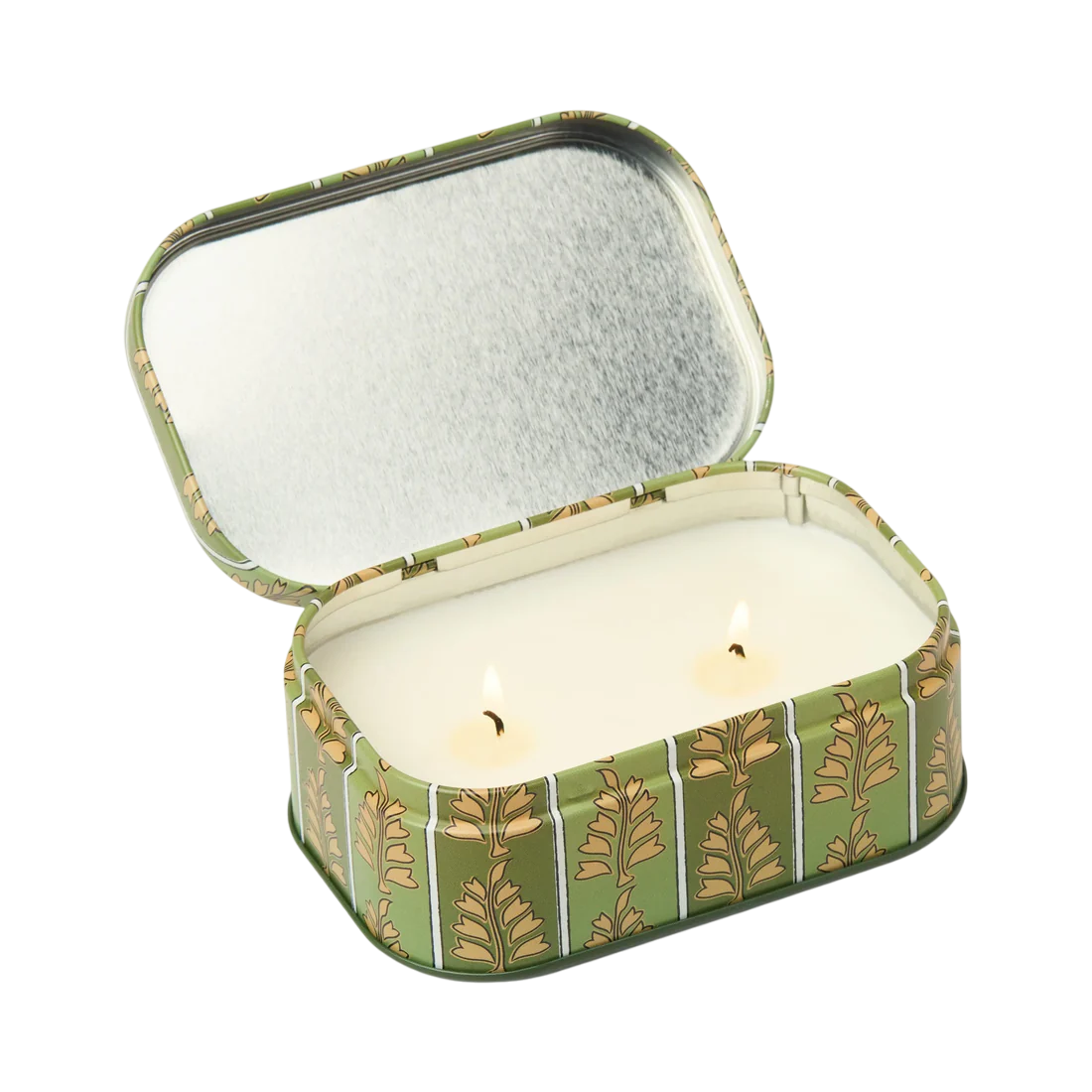 La bougie Smoked Pistachio Chérie 4,5 oz Tin Candle est présentée dans une boîte en métal à motifs avec deux mèches, un couvercle à charnière et une étiquette amovible. Une fois la bougie consumée, la boîte en métal peut être réutilisée comme boîte à bijoux ou à bibelots.